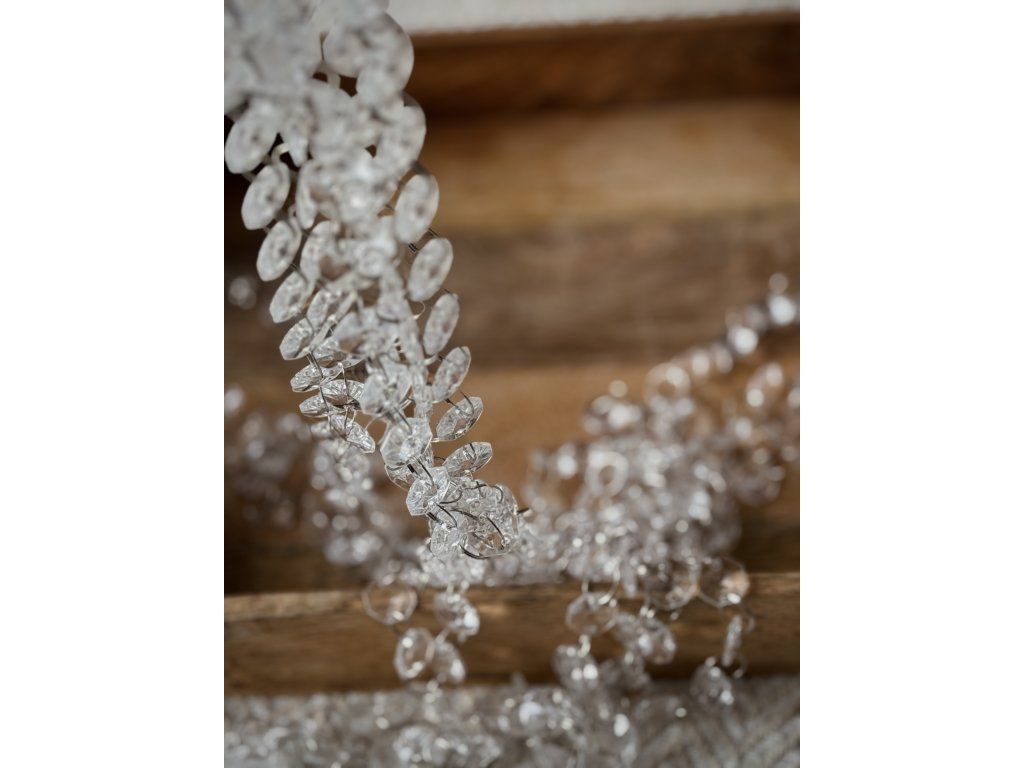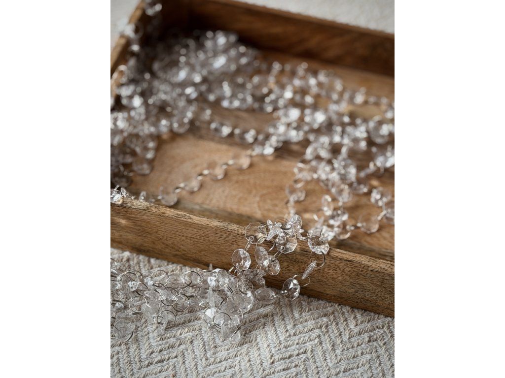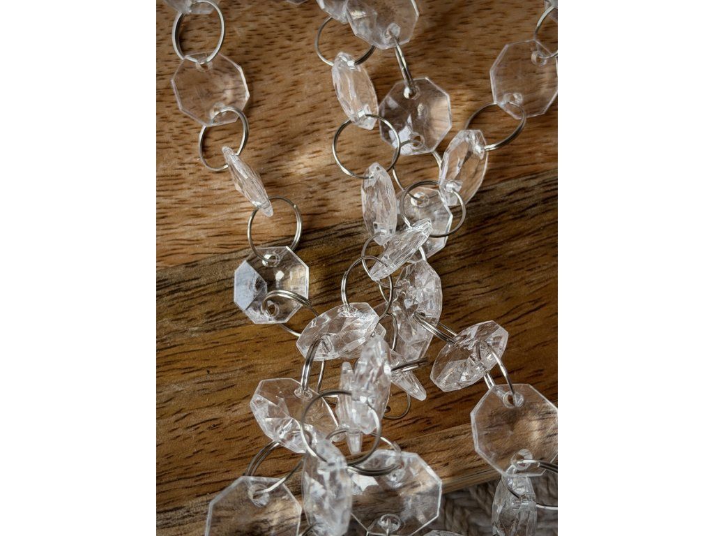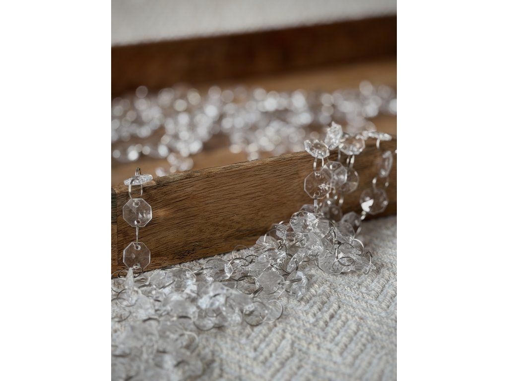 Korálková girlanda. Velice věrná imitace skla. Korálky lze snadno spojit a rozpojit. Spojovatelná z našich zásob až do délky 40m. Cena půjčovného je uvedená za 1m, do objednávky zaklikněte počet metrů.