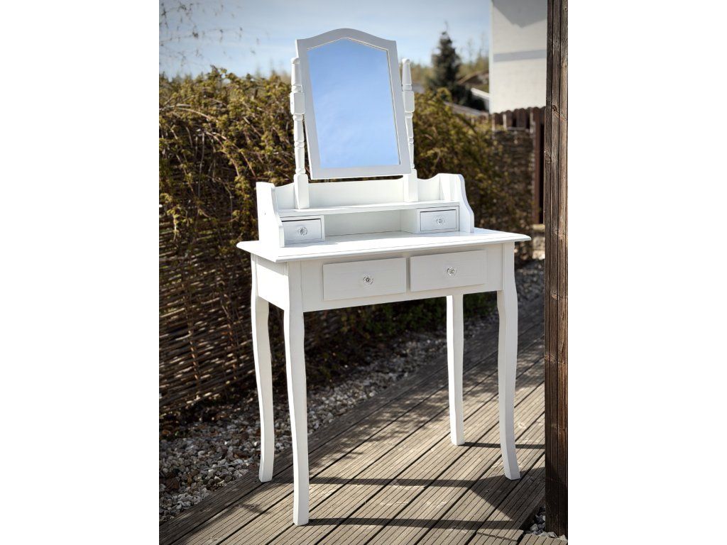 Toaletní stolek v bílé barvě. Odnímatelná nástavba se zrcadlem. Celkem 4 úložné šuplíky. K dispozici 1ks.