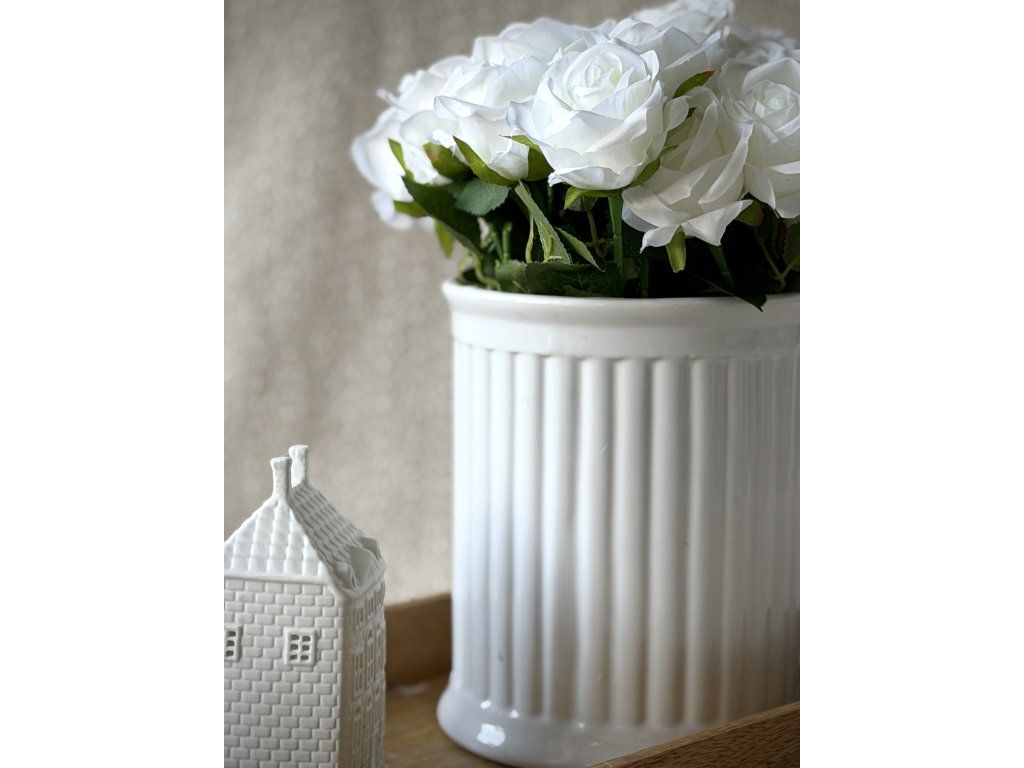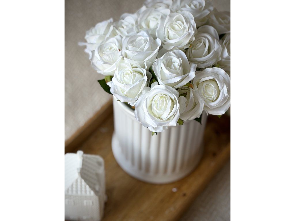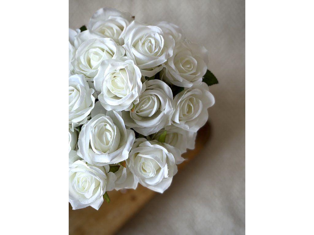 Realistická umělá růže v bílé barvě. Dva až tři listy. K dispozici 69ks.